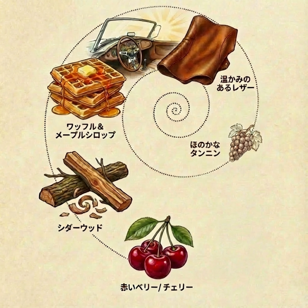 :ワッフルやメープルシロップの甘さに、温かなレザー感。ほのかな渋み(タンニン)が心地よく、ふくよかで複雑。