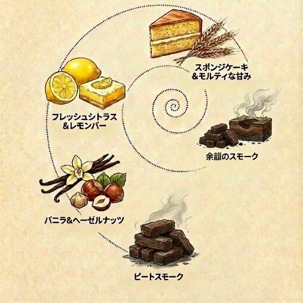:搾りたてレモンのようなシトラスのアクセントの後、スモークがふわりと引き、スポンジケーキやレモンバーの甘やかさが広がる。